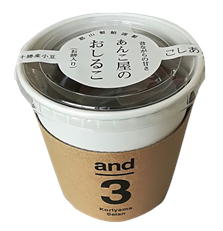 and3は、和菓子屋のあんこを作るあんこ屋が特別にこしらえた「おしるこ」と「ぜんざい」です。 冷え込む朝のお目覚めの一杯、一日を頑張れる優しいエネルギー源に。北海道十勝産大豆を使用し、昔ながらの甘さ。お餅入り。 【10月~3月頃までの期間限定販売】 |